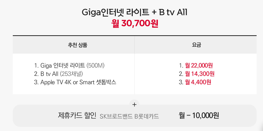 럭셔리 아이템 6종과 네이퍼 페이 선물은 12월 31일까지 Giga 인터넷 라이트 + B tv All 상품에 가입해야 받을 수 있습니다. Giga인터넷라이트 + B tv All 상품은 Giga 인터넷 라이트 500M와 B tv All 235채널 그리고 Apple TV 4K 또는 Smart 셋톱박스 모두를 포함한 상품으로 월 30,700원의 요금이 부과됩니다. 만약 제휴카드를 사용한다면 월 만원의 할인 혜택을 받을 수 있습니다.