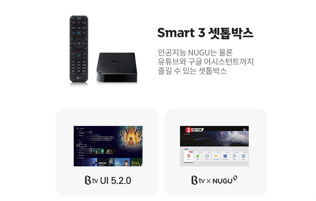 Smart 셋톱박스는 인공지능 NUGU는 물론 유튜브와 구글 어시스턴트까지 즐길 수 있는 셋톱박스로 편리한 사용이 가능합니다. 요금 변동이 없고, 다양한 기능들을 탑재하고 있어 편리하면서도 불편함 없는 활용이 장점입니다. 기본에 충실한 편리함을 원한다면 Smart 셋톱박스가 최고가 아닐까 싶습니다.
