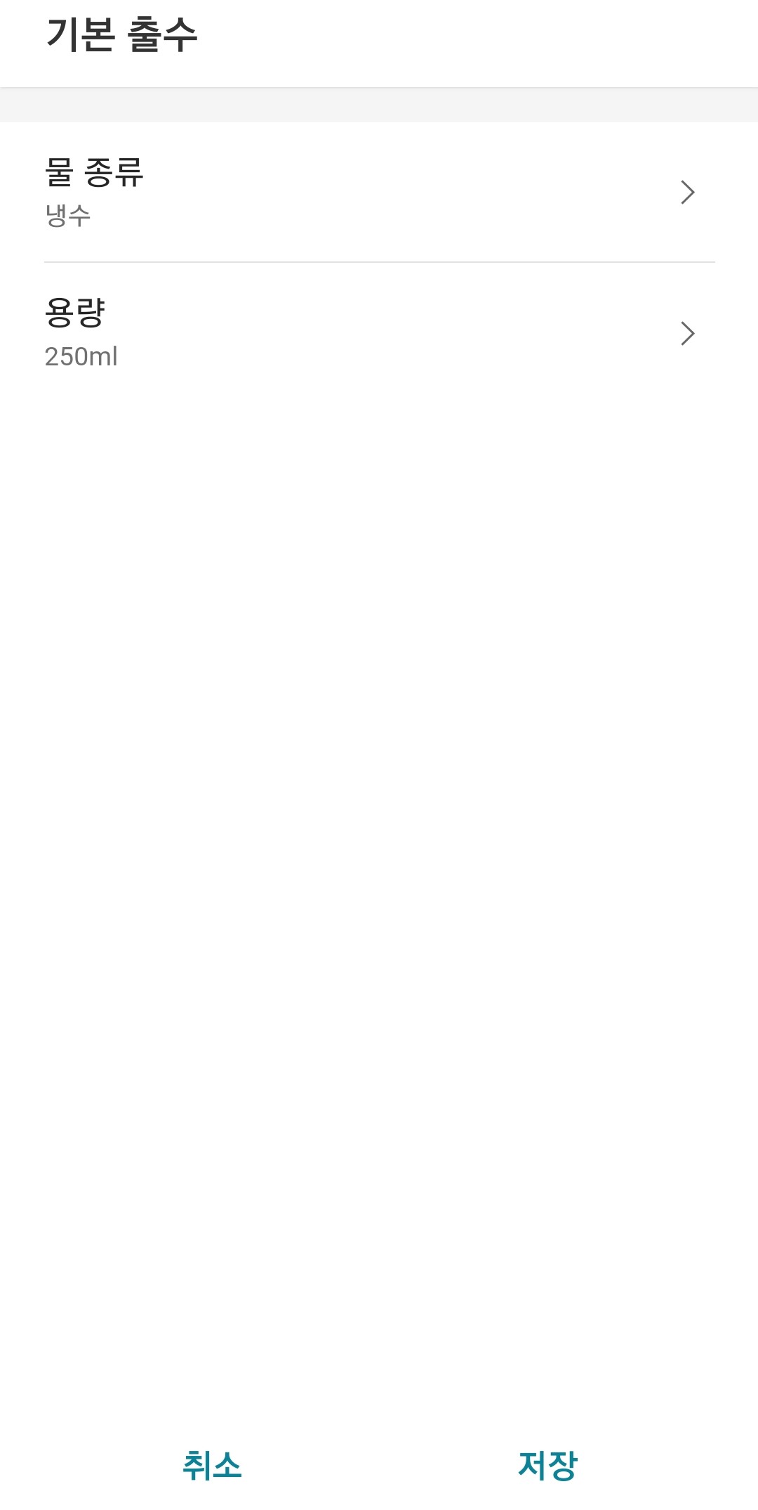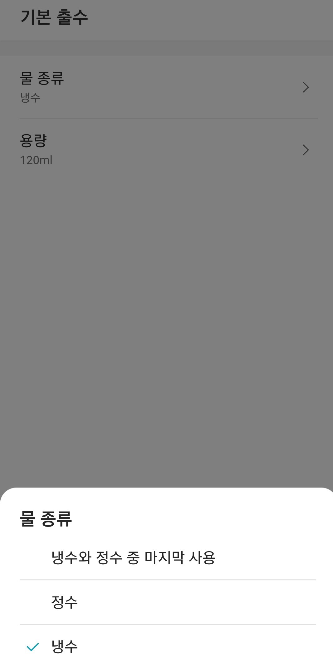 ThinQ 앱을 이용하면 기본 출수 물 종류와 용량 설정도 가능합니다. 자주 쓰는 물 종류와 용량을 정해서 편하게 사용할 수 있는 점도 특징입니다. 물 종류는 정수와 냉수 중 선택이 가능하고, 용량도 선택할 수 있습니다. 이때 온수는 안전 상의 이유로 선택할 수 없다고 하는데요, 평소 차가운물 대신 정수를 많이 사용하거나, 반대의 경우에도 일일이 버튼을 누를 필요 없이 간단한 설정하나로 불편함 없이 사용할 수 있으니 참 편리합니다.