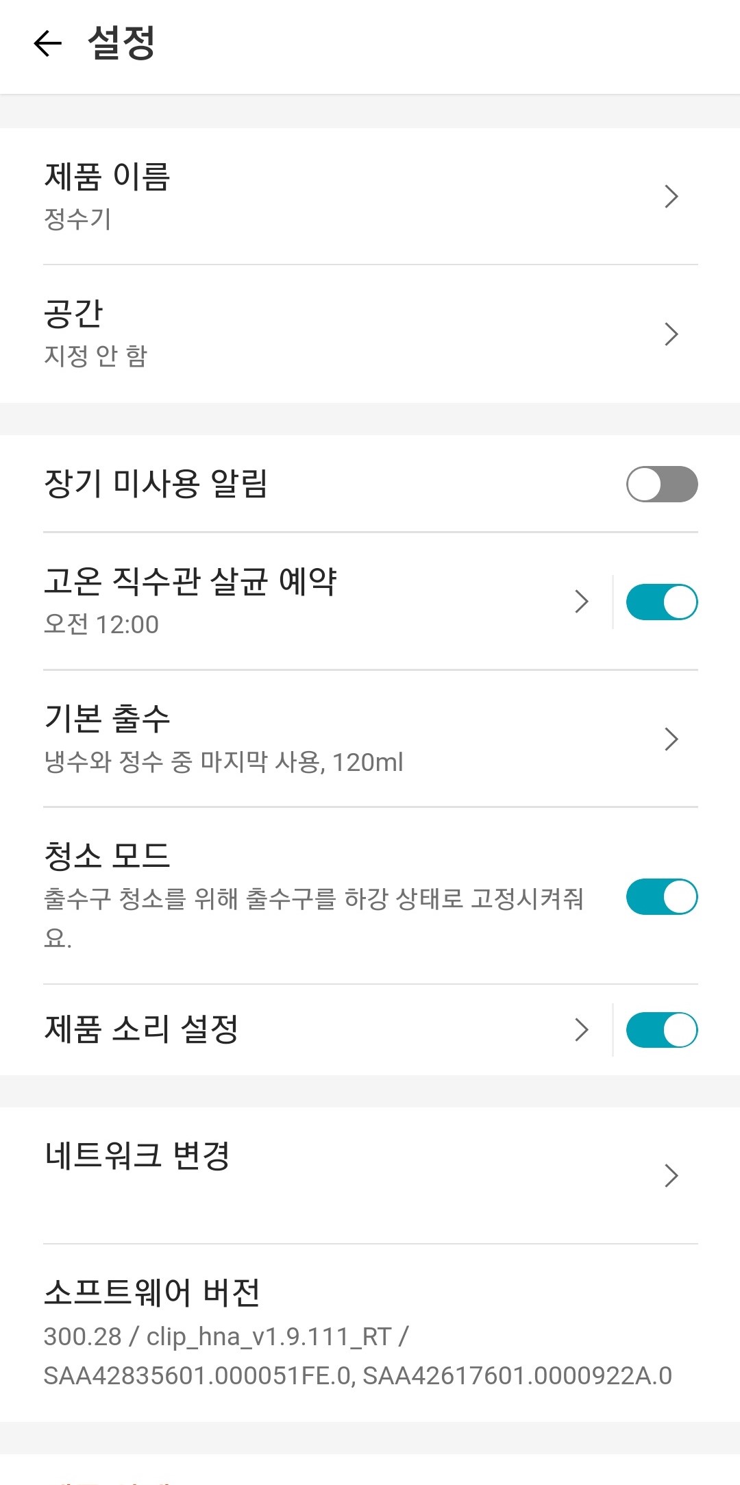 ThinQ 앱을 활용하면 보다 효율적인 LG상하좌우 정수기 사용이 가능합니다. 먼저 음성안내와 음량을 조절할 수 있는데요, 제품 소리 설정이라는 메뉴에서 음성안내 사용, 소리 크기, 버튼음 음소거 설정이 가능합니다. 아무래 늦은 밤 가족들이 곤히 잠든 사이 물 한잔 마시려고 버튼을 눌렀을 때 나오는 소리에 놀라는 경우가 종종 있는데요, 이럴 때 소리를 줄이거나 끄면 놀라는 일 없이 편하게 사용할 수 있습니다.
