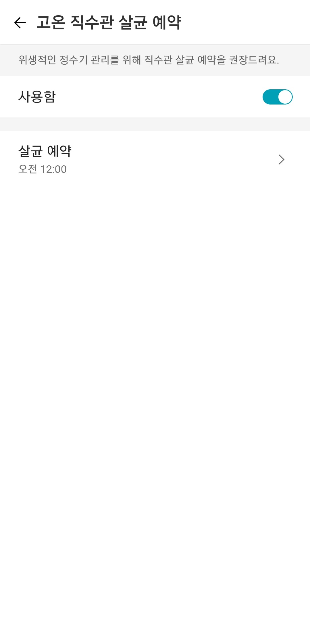 * LG ThinQ 앱에서 고온 직수관 살균 예약 기능을 off 하신 경우 자동으로 작동되지 않습니다.