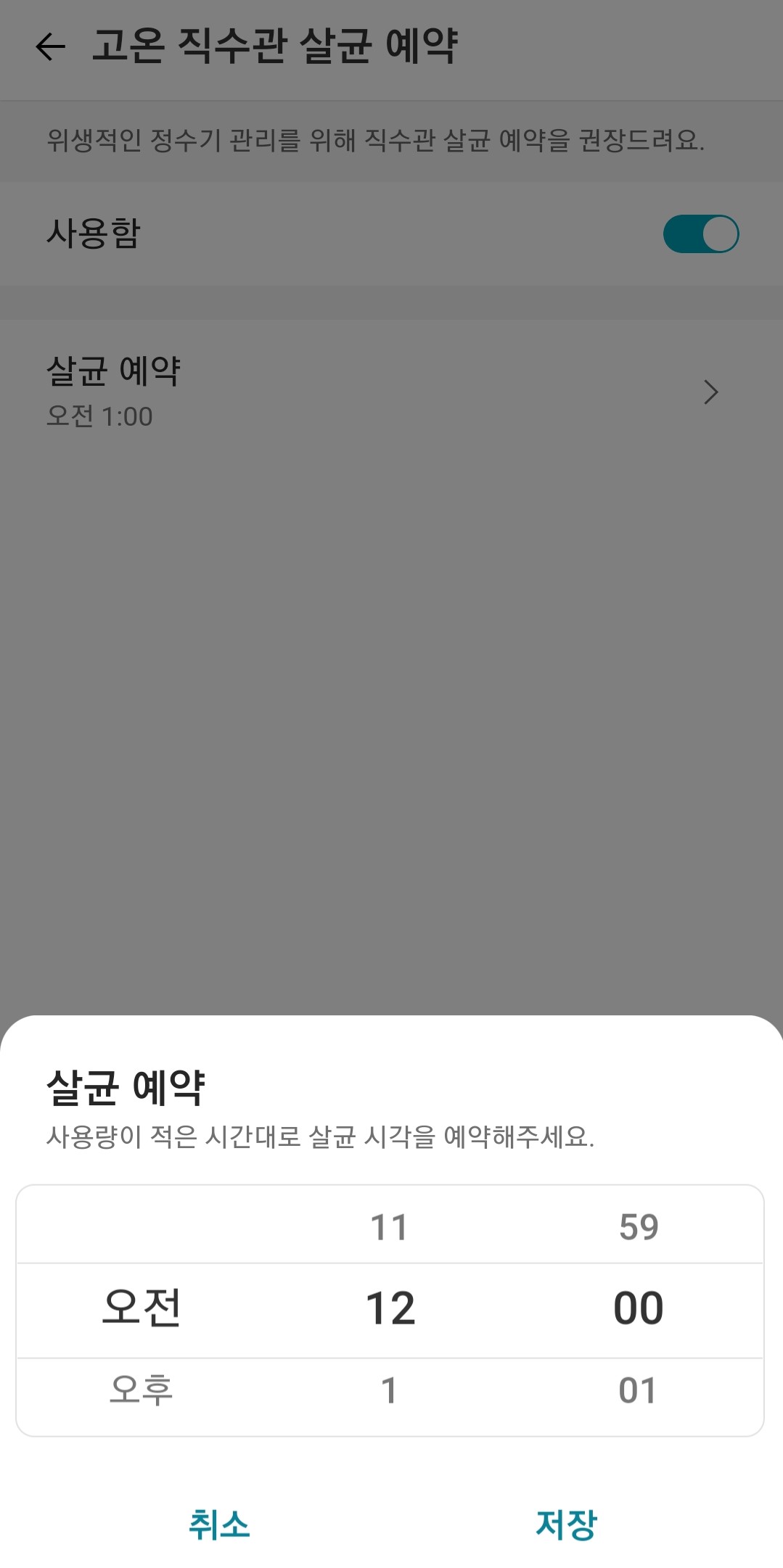 수동으로 직수관을 살균하는 법 외에도 예약을 통해 고온 직수관 살균을 할 수 있습니다. 예약하면 1주일에 한번씩 정해진 시간에 살균을 진행하는데요, 예약 살균의 경우 수동 살균과 다르게 시작할 때 음성안내가 없고, 살균 완료 후 처음 물을 뽑을 때 살균을 마쳤다는 안내를 통해 진행 여부를 확인할 수 있습니다.