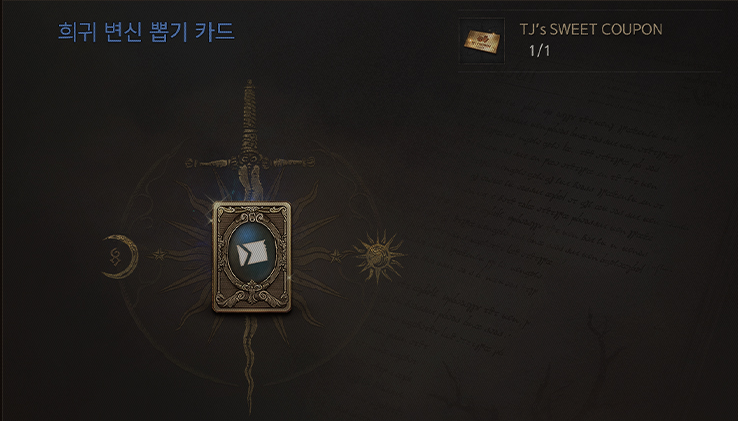 TJ's SWEET COUPON은 1월 18일까지 진행되는 출석체크 시즌4 14일차 보상으로 받을 수 있습니다. 2021년 12월 31일까지 변신과 마법인형 합성 이력 중 도전 가능한 최고 등급 합성을 할 수 있으며, 해당 정보를 바탕으로 변신과 마법인형 합성 중 하나를 선택하여 사용 가능합니다. 만약 영웅 이상의 도전 이력이 없다면 희귀 등급 뽑기권을 제작해 사용할 수 있습니다.