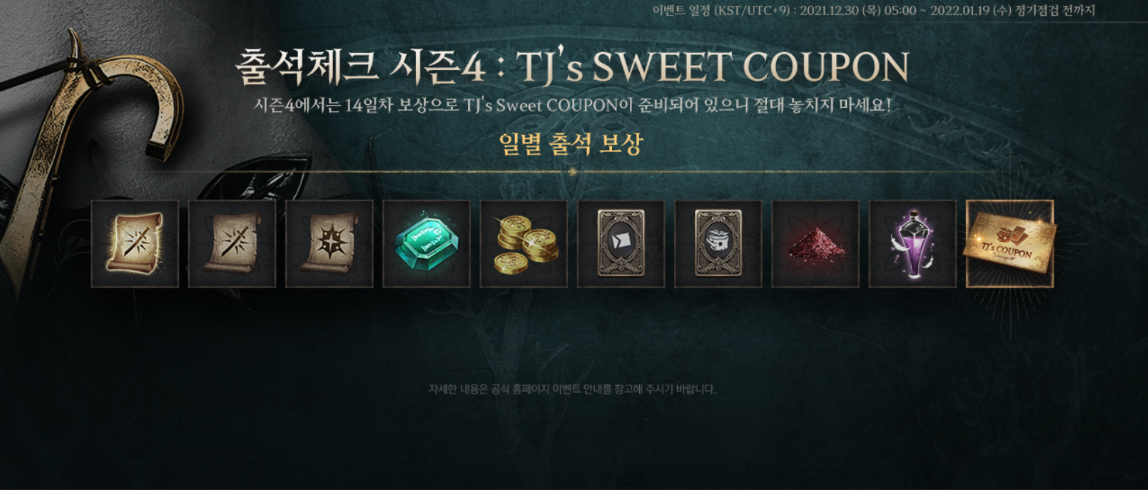 TJ's SWEET COUPON을 받을 수 있는 출석체크 시즌4의 경우 일일 획득할 수 있는 보상도 상당한데요, 일일 보상으로 용기의 물약이 10개씩 주어지고, 아데나, 무기 마법 주문서, 갑옷 마법 주문서, 축복 받은 무기 마법 주문서를 비롯한 추가 아이템 획득도 가능해 14일 최종 보상까지 달리는 시간이 지루하지 않을 것 같습니다.