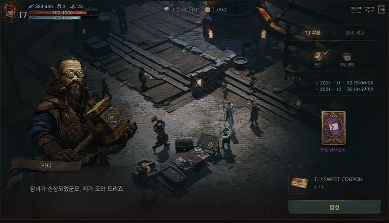 TJ's SWEET COUPON 사용은 켄트성 마을에 위치한 전문 복구사 지니에게 의뢰하여 원하는 방향으로 사용 가능합니다. 전문 복구사 지니에게 TJ쿠폰 복구 요청 시 TJ쿠폰 탭 선택 후 변신과 마법인형 중 원하는 항목을 선택한 다음 선택한 항목에 맞춰 합성 컷신이 진행되면서 사용하게 됩니다. 이때 영웅 등급 이상 합성 기록이 없다면 활성화되지 않습니다.