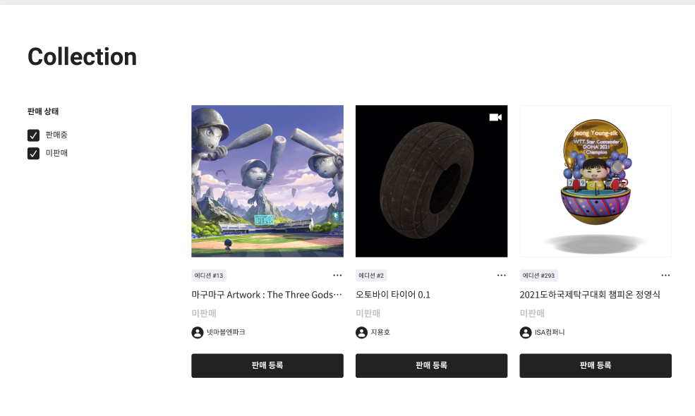 보유한 NFT관리도 수월한데요, 컬렉션을 통해 보유하고 있는 NFT를 확인할 수 있고, 판매 등록도 가능합니다. 또한 거래를 통해 NFT마켓에서 거래한 내역을 파악할 수 있고, 판매자에게 제안한 가격을 확인하거나, 구매 희망자에게 받은 가격 제안을 확인하고 수락할 수도 있어 NFT 자산을 보다 쉽고 수월하게 수집하고 거래할 수 있습니다.