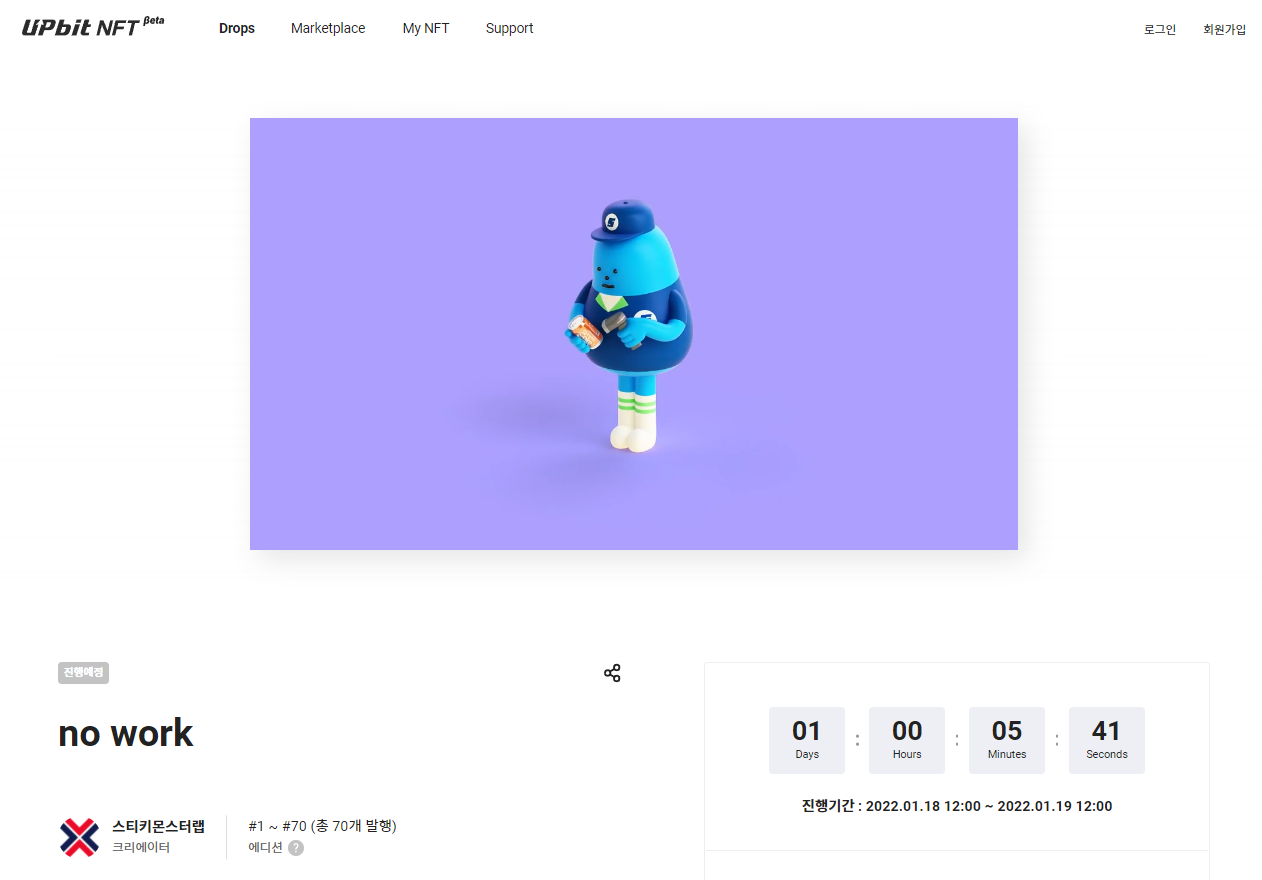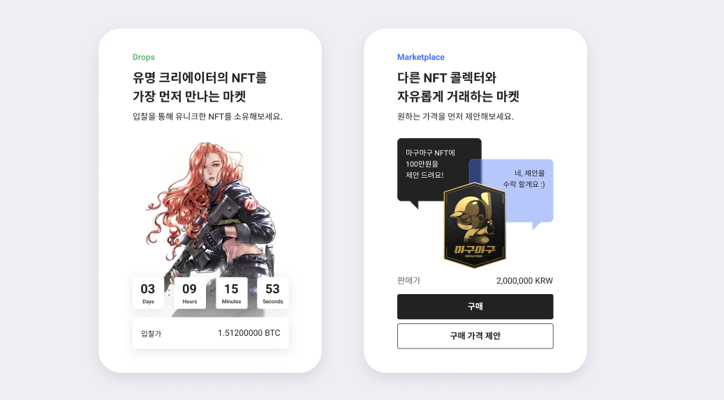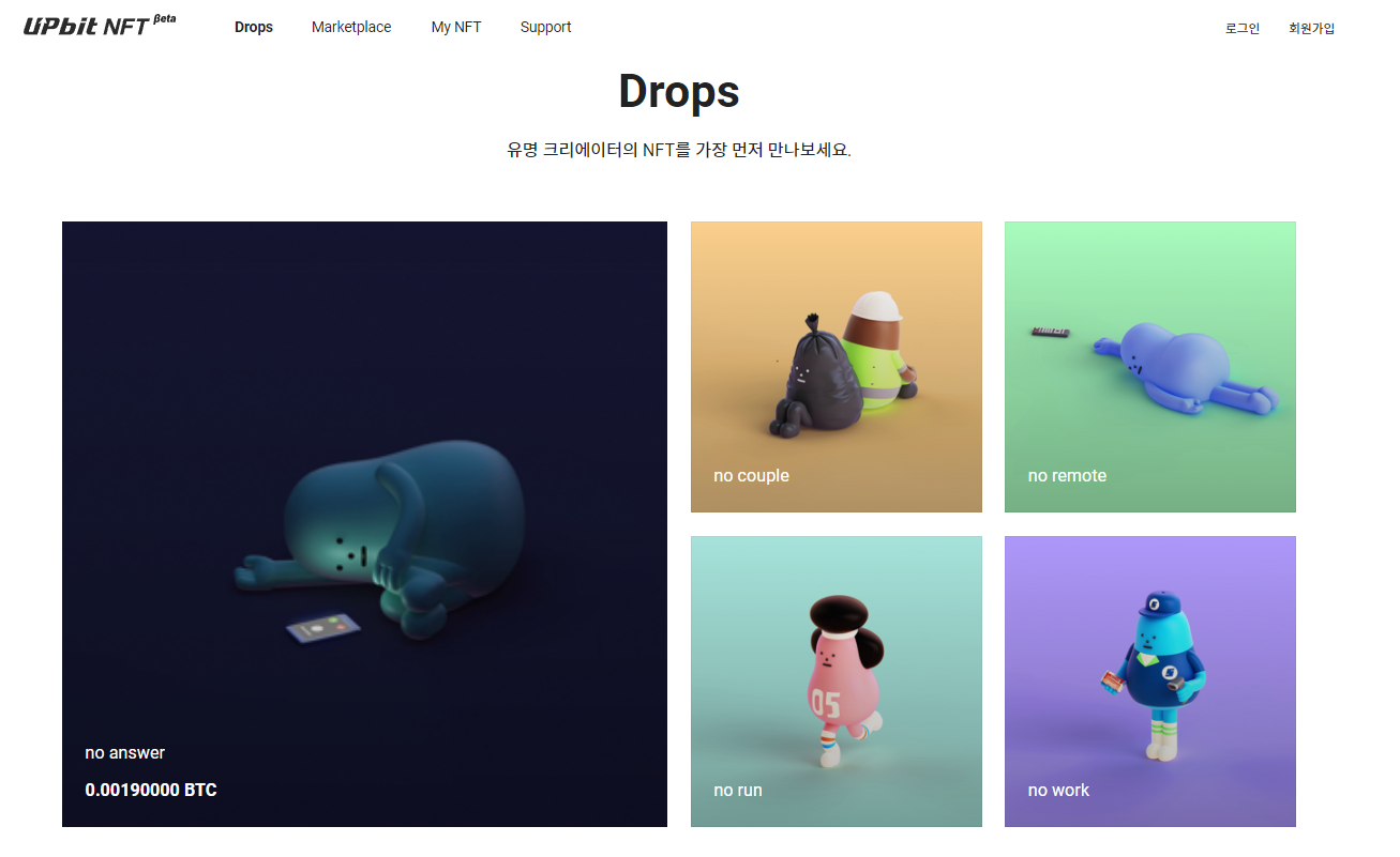 업비트 NFT Beta에서는 드롭스와 마켓플레이스로 불리는 두가지 마켓을 제공하고 있어 경매를 통한 NFT를 소유하거나, 다른 콜렉터와 자유로운 거래를 진행할 수 있기도 합니다.