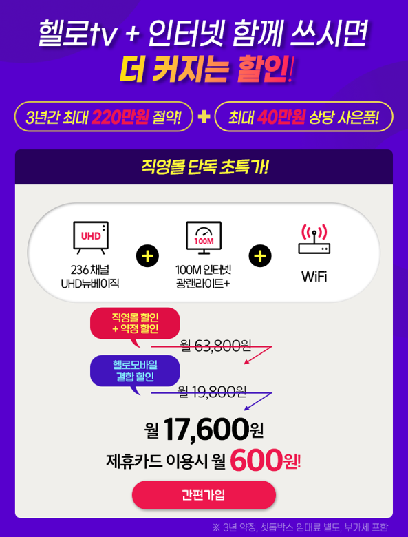 헬로tv와 헬로인터넷을 함께 가입하면 할인폭이 더욱 늘어납니다. 236 채널 UHD뉴 베이식에 100M 인터넷 광랜 라이트+ 와이파이가 결합된 상품을 선택할 경우 직영몰 할인과 약정 할인이 더해져도 6만 원대 비용을 지급해야 하는데요, 여기서 헬로모바일 결합할인까지 더해 월 17,600원의 비용으로 이용할 수 있습니다. 제휴카드를 이용하면 월 600원의 비용이 청구됩니다.