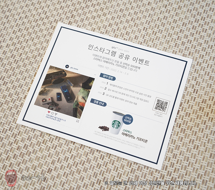 제이블랙 한정판 스킨 출시 기념 인스타그램 공유 이벤트도 진행 중입니다. 제이블랙 스킨이 부착된 글로 프로 슬림을 촬영해 필수 해시태크와 함께 개인 인스타그램 계정에 업로드 하고, 이벤트 참여 정보를 제출하면 되는데요, 선착순 스타벅스 상품권 1만원을 선물로 증정합니다. 선착순 경품은 빠르게 조기 마감이 되는 만큼 구매를 망설이고 있던 분들이라면 서둘러 구매하시고, 제이블랙 한정판 스킨과 스타벅스 1만원 기프티콘의 주인공이 되어보시기 바랍니다.