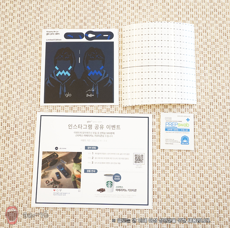 제이블랙 한정판 스킨도 빼놓을 수 없는데요, 한정판 글로 슬림 프로를 구매하면 정사각형의 봉투에 글로 프로 슬림 한정판 스킨과 알콜솜 그리고 인스타그램 공유 이벤트 안내를 확인할 수 있습니다.