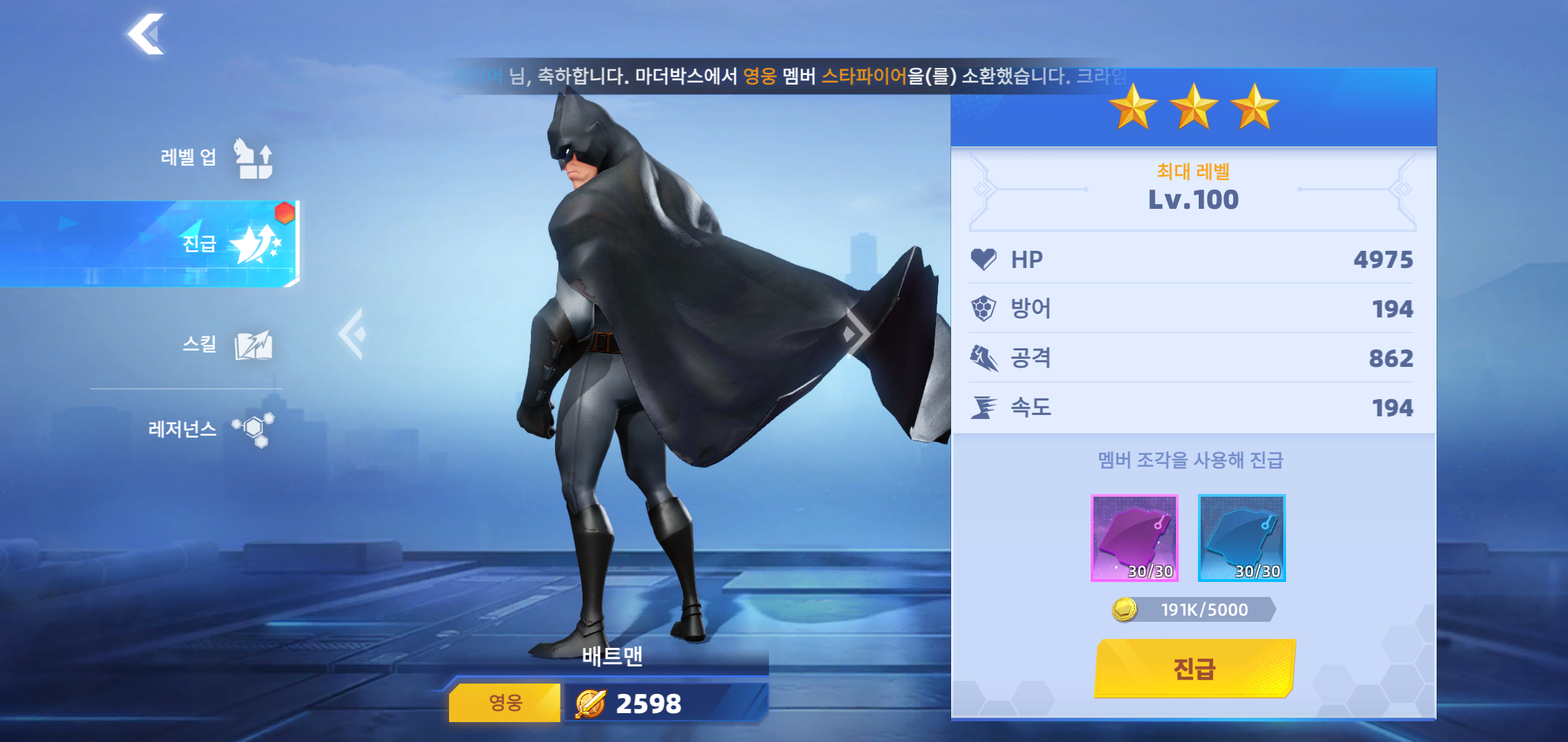 특히 영웅 등급의 히어로들이라도 획득 시 3 성부터 시작해 지속적인 진급이 필요합니다. 진급에 필요한 아이템의 경우 동일한 히어로 조각이 아니더라도 등급에 맞는 조각이 갖춰지면 더욱 강한 히어로 진급이 가능하기 때문에 필요한 아이템을 획득하기 위한 플레이만큼 필요한 게 없는 듯 생각됩니다.