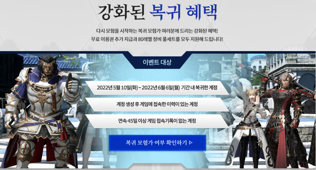복귀 유저를 위한 혜택도 준비되어 있습니다. 5월 10일~ 6일 6일 기간 내 복귀한 유저에 대하여 정액권 이용권 구매 시 3일 무료 이용권이 추가로 주어지며, 80 레벨 장비가 지급되어 복귀하기 딱 좋은 시점이기도 합니다.