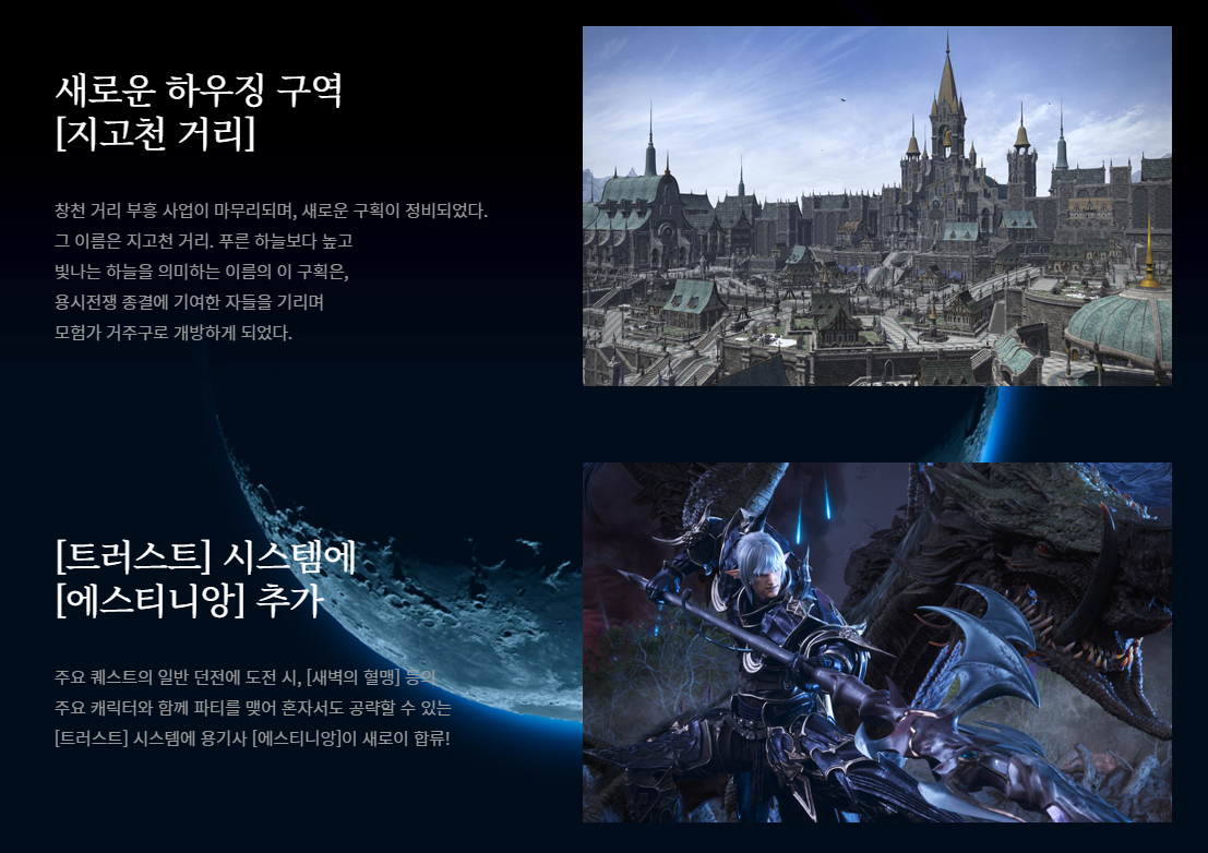 이외에도 신규 수인족인 아르카소다라족과 레포릿이 추가되었고, 90 레벨 상한 개방, 다수의 새로운 장비 출시와 제작법 등이 업데이트되었습니다. 또한 새로운 하우징 구역인 지고천 거리가 추가되었는데요, 가맹 PC방 혜택도 강화되었습니다.