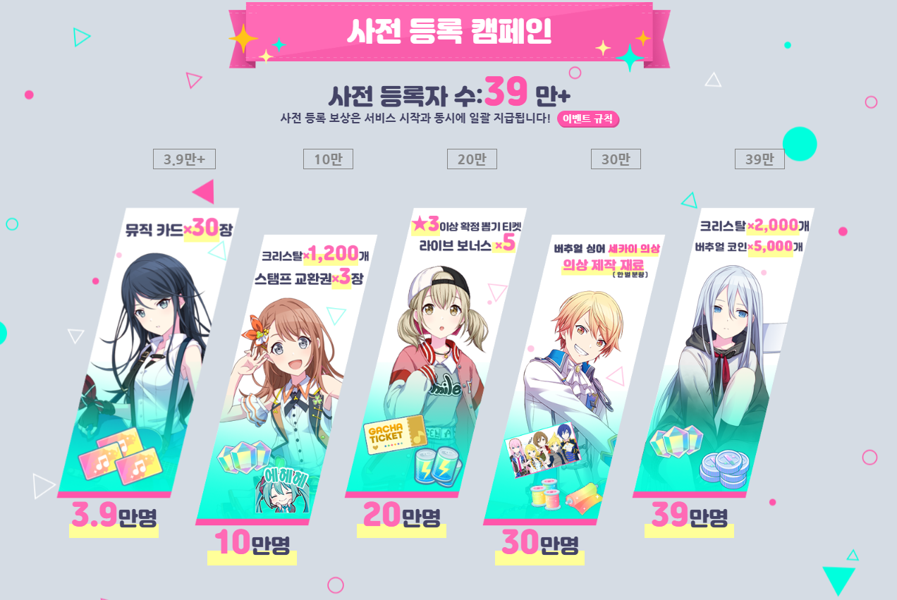 모바일 리듬게임 프로젝트 세카이 사전예약은 정식 론칭 전까지 진행되며, 사전등록자 수에 따라 선물을 받을 수 있습니다. 3.9명부터 시작해 39만 명 달성까지 달성 인원에 따라 누적해 선물이 지급되는데요, 최종 목표인 39만 명 사전예약인원을 돌파해 모든 보상을 챙길 수 있으니 서둘러 참여하고 보상도 챙겨보시기 바랍니다.