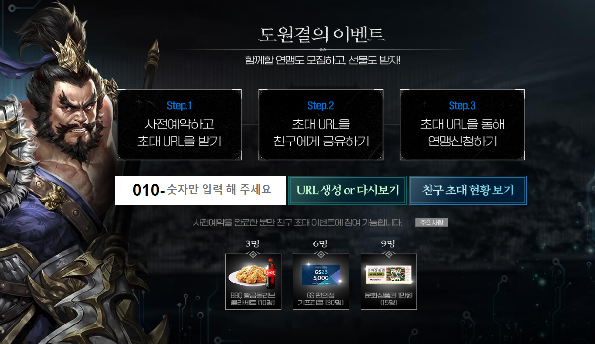 함께할 친구를 초대하고 선물을 받을 수 있는 도원결의 이벤트도 시작되었습니다. 사전예약에 참여후 초대 URL을 받아 친구에게 공유하고, 공유받은 친구가 초대 URL을 통해 연맹을 신청하는 방식으로 참여한 인원 중 조건에 맞는 인원을 추첨해 문화상품권부터 편의점 기프티콘과 BBQ 치킨 기프티콘까지 받을 수 있습니다.