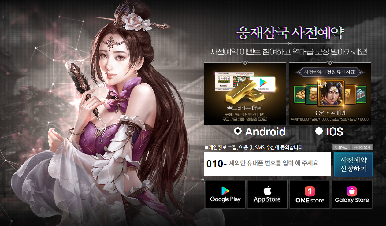 할만한 삼국지전략게임 웅재삼국 사전예약은 정식 론칭 전까지 진행됩니다. 휴대폰 번호만 입력하면 간단하게 참여 할 수 있으며, 참여한 모든 인원에게는 조운 조각 10개, 목재 / 군량 1만 개, 금권 300개 그리고 은냥 1만 개를 전원에게 지급합니다. 여기에 추첨을 통해 골드바 1돈 3명, 문화상품권 5만 원권 10명, 구글 기프티콘 1만 원권 50명을 지급합니다.