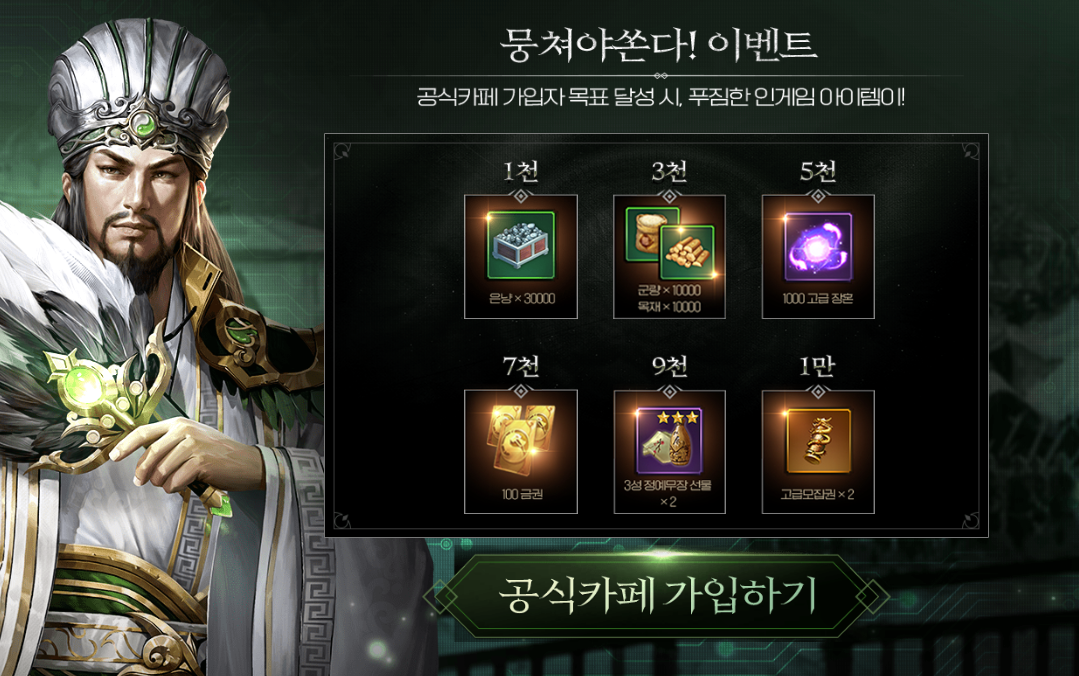 공식 카페 가입 이벤트도 진행 중입니다. 공식 카페 가입자 목표 달성 시 인게임 아이템이 주어지는데요, 1천 명을 시작으로 3천, 5천, 7천, 9천 그리고 1만 명 돌파시 인게임 아이템을 누적하여 지급합니다.