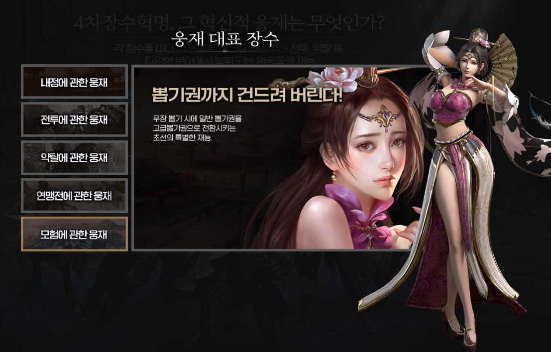 현재 공개된 웅재 대표 장수를 확인해보면 내정, 전투, 약탈, 연맹전 그리고 모험에 대한 웅재로 구분되어 대표장수를 확인할 수 있는데요, 각각의 장수마다 저마다의 특별한 재능을 보유하고 있어 이를 어떻게 활용하느냐에 따라 플레이의 방식이나 흐름이 달라질 것으로 예상됩니다.