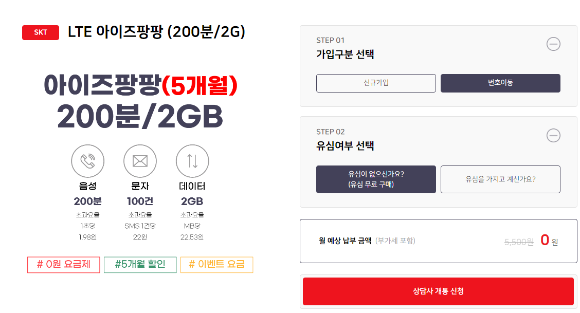 SKT LTE 아이즈팡팡(200분/2G) 요금제 (0원)도 준비되어 있습니다. 월 데이터 2G를 지급하고 통화 200분, 문자 100건이 지급되는데요, 무약정 5개월간 기본료가 0원으로 사용 가능합니다. 메인 상품까지 필요하지 않은 분들에게는 딱 좋은 요금제인데요, 통화를 자주는 아니지만 사용하고, 데이터는 거의 쓰지 않은다면 적당한 요금제입니다.