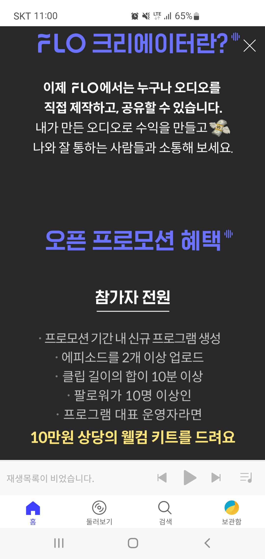 FLO크리에이터는 FLO에서 직접 오디오를 제작하고 공유할 수 있고 더불어 내가 만든 오디오로 수익을 만들 수 있습니다. 특히 이번 오픈 프로모션 혜택으로 참가자 전원에게는 주어진 조건을 만족할 경우 10만원 상당의 웰컴키트까지 선물로 주어진다고 합니다.