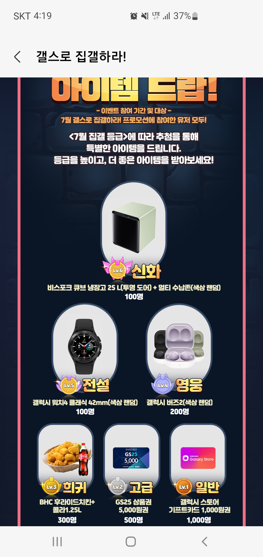 7월 한정 등급별 경품 이벤트도 준비되어 있는데요, 7월 갤스로 집결하라 프로모션에 참여한 유저 중 추첨을 통해 갤럭시 스토어에서 준비한 특별한 선물을 받을 수 있습니다.
