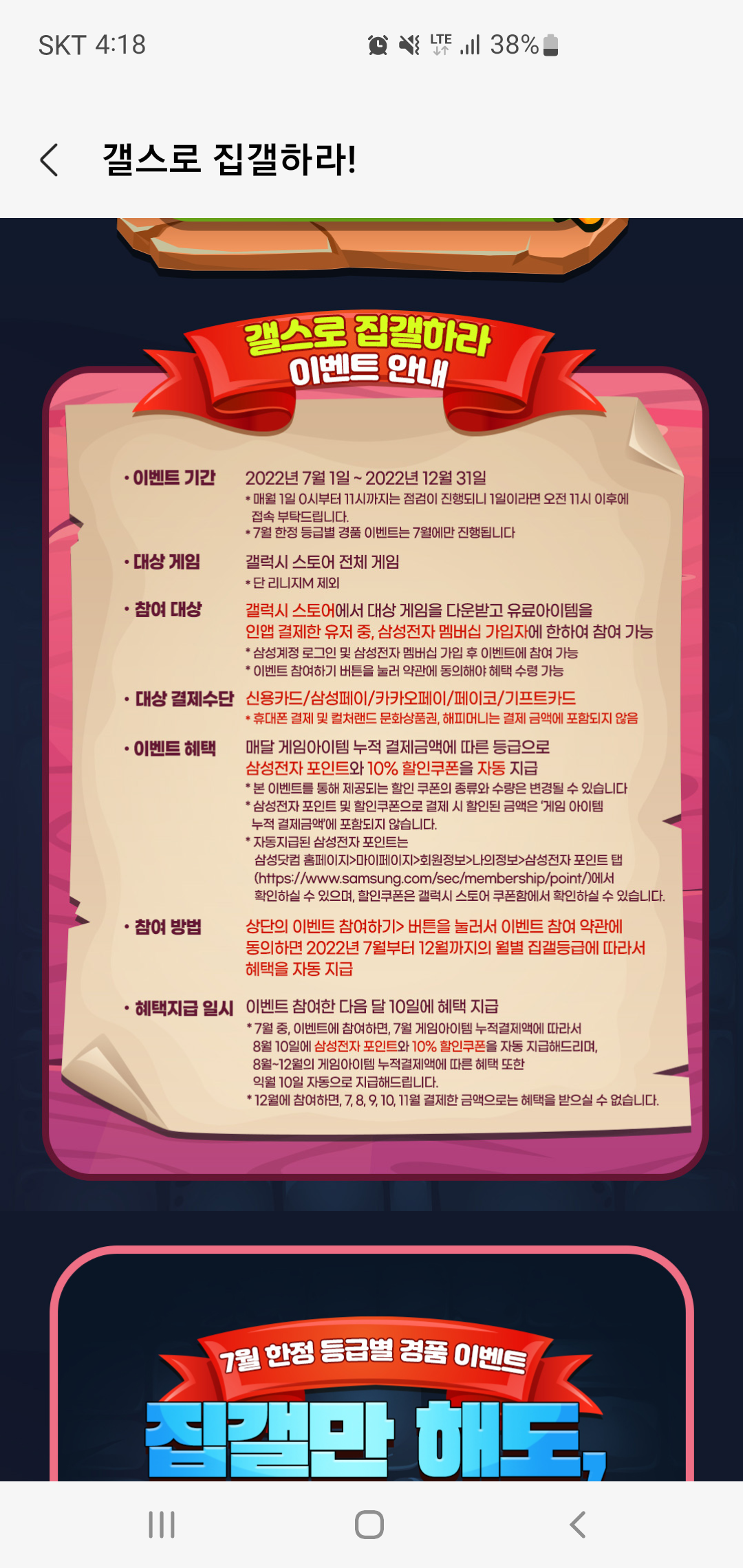 갤럭시스토어에서 진행 중인 갤스로 집결하라 이벤트의 경우 2022년 7월 1일부터 2022년 12월 31일까지 진행되는 이벤트로 한 달 동안의 누적 결제 금액에 따라 삼성전자 포인트와 10% 할인 쿠폰을 받아갈 수 있는 프로모션입니다. 기존에 진행하던 게임 아이템 결제마다 삼성전자 포인트 10% 추가 적립 이벤트가 종료된 후 새롭게 시작된 이벤트입니다.