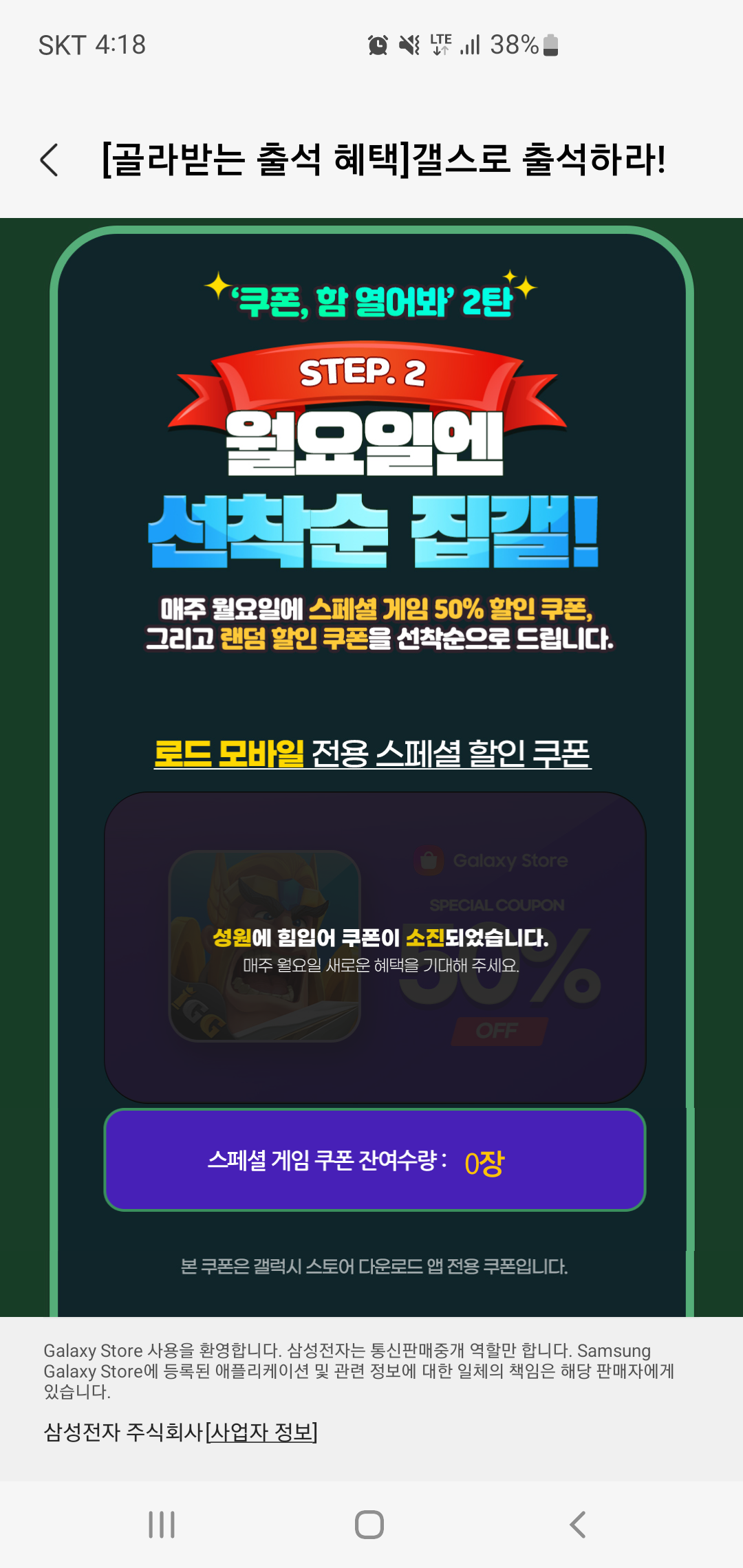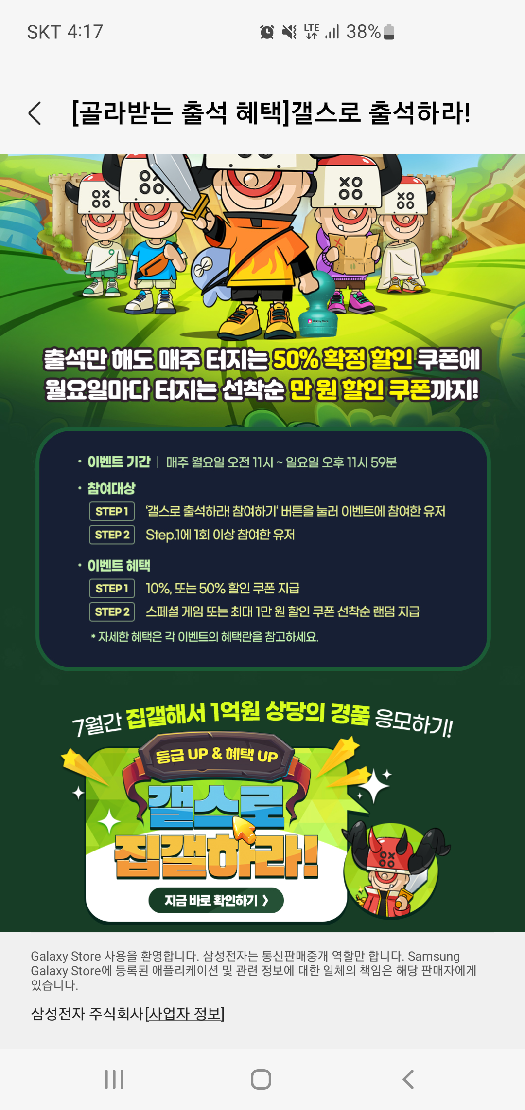 특히 매주 월요일에는 선착순 집갤로 스페셜 게임 50% 할인 쿠폰과 랜덤 할인 쿠폰을 선착순으로 지급하는데요, 매주 월요일 어떤 게임 쿠폰이 지급되는지 알 수 없는 만큼 조금 서둘러 확인하고 쿠폰을 챙길 필요가 있어 보입니다. 갤스로 집갤하라 프로모선과 갤스로 출석하라 이벤트만 잘 챙겨도 사용한 이상의 혜택을 돌라 받을 수 있는 지금 평소 모바일게임 유료 아이템을 구매하는 분들이라면 갤럭시스토어를 이용해 삼성전자 포인트와 10% 할인 쿠폰까지 모두 챙겨보시기 바랍니다.