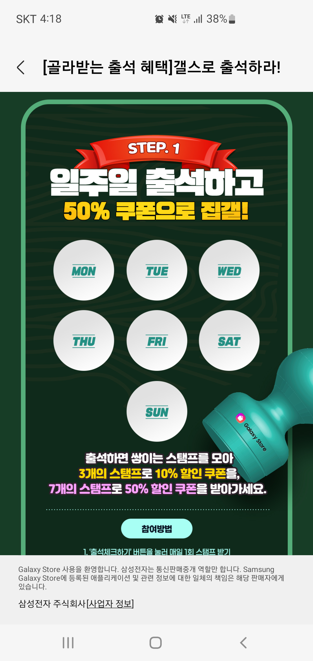 갤스로 출석하라 이벤트는 일주일 동안 출석으로 받은 3개의 스탬프로 10% 할인 쿠폰(매주 최대 2회, 최대 5천원 할인)을 받을 수 있고, 매일 출석했다면 총 7개의 스탬프를 통해 50% 할인 쿠폰을 받을 수 있습니다. 단, 중복으로 받을 수 없는 만큼 최대 50%를 획득할 수 있도록 매일 출석하는 게 여러모로 이득이겠죠?