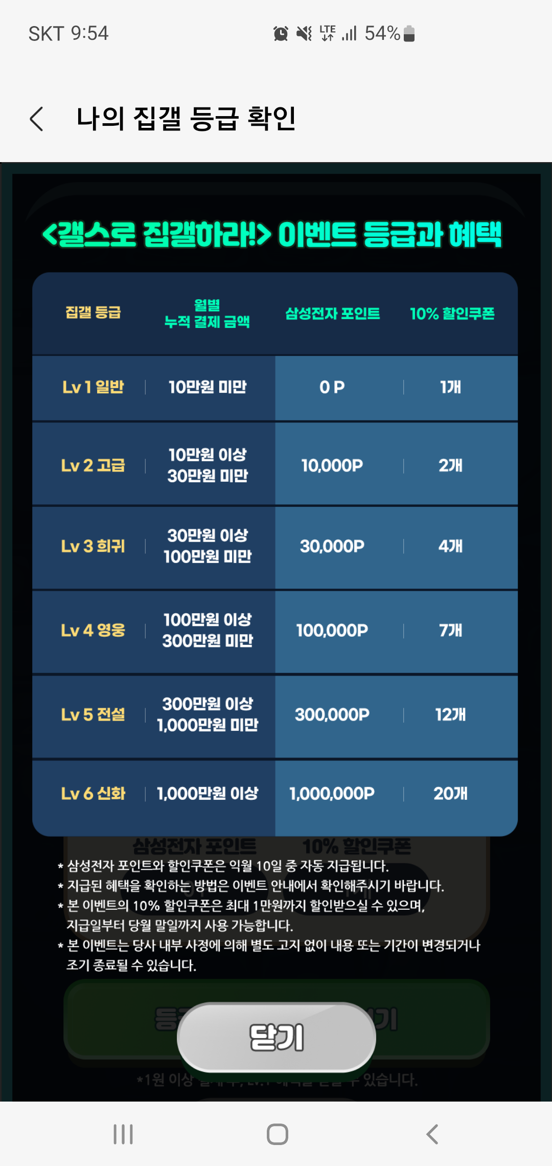 갤스로 집갤하라 이벤트에 참여하면 매월 게임 아이템 구매 누적 금액에 따른 삼성 포인트와 10% 할인 쿠폰이 자동으로 지급됩니다. 이때 집갤 등급 기준에 따라 Lv1 일반등급부터 Lv6 신화 등급까지 차등으로 삼성전자 포인트와 할인쿠폰이 차등 지급됩니다.