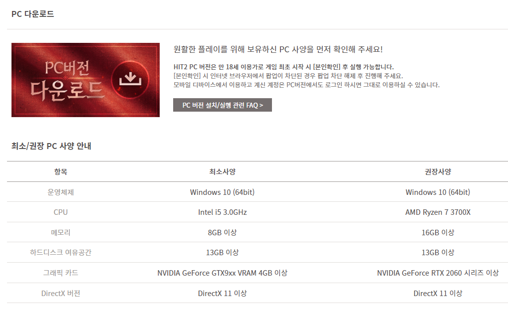 8월 18일부터 시작된 PC버전 다운로드는 히트2 홈페이지를 통해 진행 가능합니다. 고퀄리티 그래픽과 화려한 스킬을 바탕으로 한 손맛을 즐길 수 있어 권장사양은 조금 높게 느껴지기도 하는데요, 최소사양만 되어도 히트2 (HIT2)를 즐기는 데는 불편함이 없는 만큼 부담 갖지 않아도 좋을 것 같습니다.