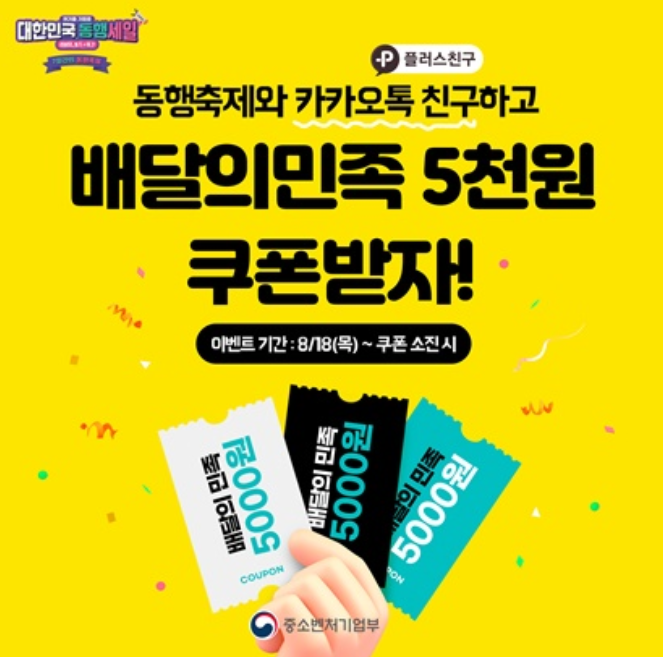 배달의민족 5천 원 쿠폰을 받을 수 있는 카카오톡채널 추가하기 이벤트도 진행 중입니다. 해당 이벤트는 쿠폰 소진시까지 진행되는데요, 대한민국 동행세일 카카오톡 채널을 검색하거나 QR코드를 스캔해 친구 추가하면 문자로 배달의민족 5천원 쿠폰이 주어집니다.