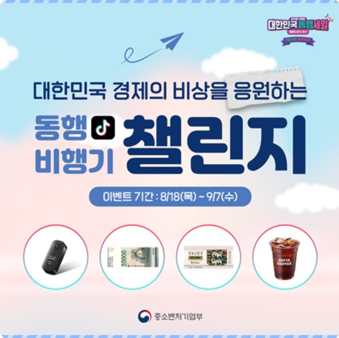 9월 1일부터 진행되는 7일간의 동행축제를 앞두고 다양한 이벤트도 진행 중입니다. 대한민국 경제의 비상을 응원하는 동행 비행기 챌린지는 틱톡에서 #동행비행기챌린지를 검색후 영상 하단 살래팔래송을 클릭해 음원 사용하기를 선택한 다음 살래팔래송에 맞추어 동행 비행기를 날리며 영상을 촬영해 필수 해시태그와 함께 틱톡에 전체 공개로 업로드하면 추첨을 통해 문화상품권, 아이스 아메리카노 등의 선물이 주어집니다.
