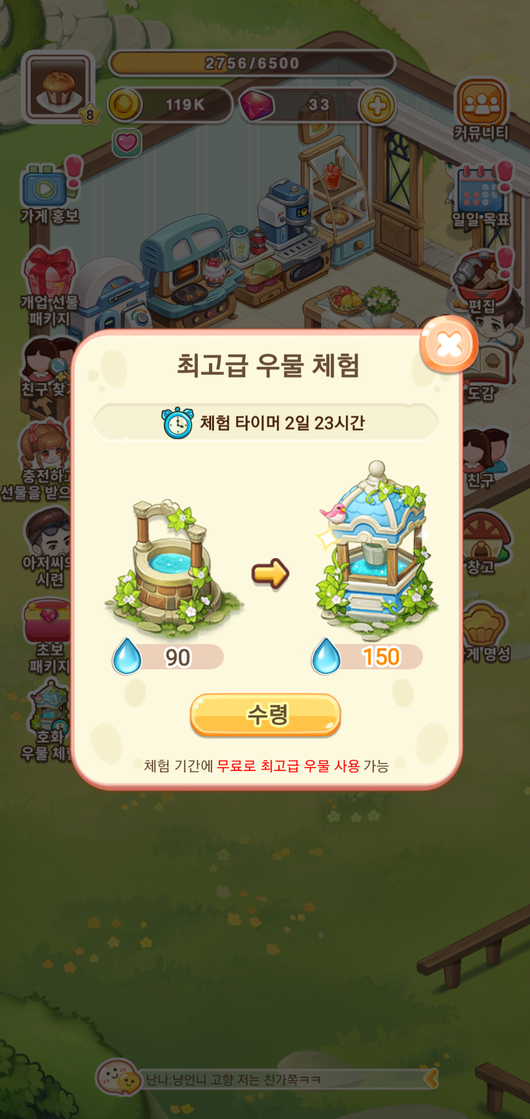 쿠폰 외에도 다양한 방식으로 두디카에서 필요한 아이템을 획득할 수 있는 이벤트가 진행 중인데요, 간단한 광고를 시청하고 가게 홍보를 하는 이벤트라던가, 최고급 우물 체험 등이 준비되어 있고, 크고 작은 돌발 이벤트도 진행되어 지루 할 틈 없는 플레이를 즐길 수 있는 만큼 아기자기한 나만의 디저트 카페를 운영하는 재미를 즐겨보고 싶다면 지금 두근두근 디저트 카페를 시작해보세요!