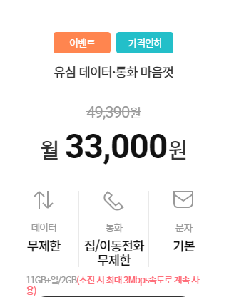 유심 데이터 통화 마음껏 요금제는 월 33,000원의 비용으로 데이터 무제한/ 집 이동전화 무제한 그리고 기본 문자 사용이 가능한데요, 데이터의 경우 11GB 데이터 소진시 매일 2GB를 제공받을 수 있고 이후 최대 3Mbps 속도로 데이터를 무제한 사용할 수 있습니다.