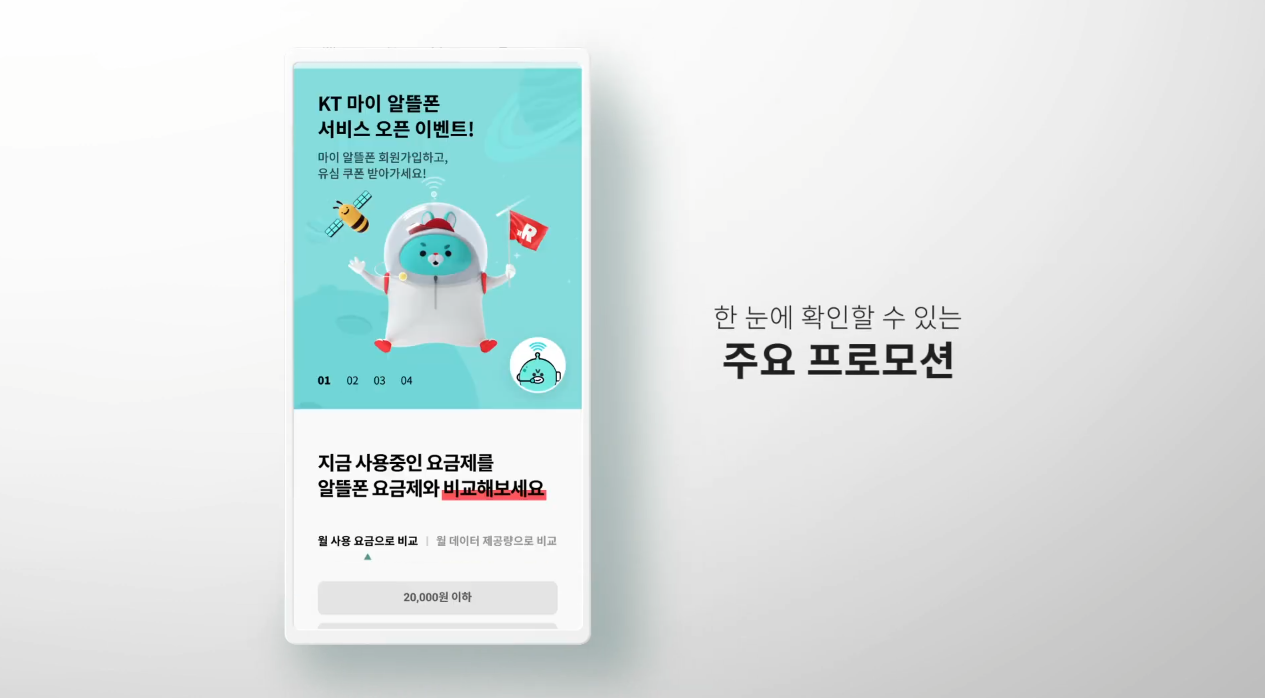마이알뜰폰은 KT 알뜰폰 전용 서비스로 알뜰폰 상품 정보 확인부터 가입, 개통, 변경까지도 한번에 가능한 점이 특징입니다. 뿐만 아니라 현재 사용중인 알뜰폰 데이터 사용량 확인부터 명세서 관리까지 한번에 확인하고 관리할 수 있도록 구성어 있어 편리한 장점을 가지고 있습니다.