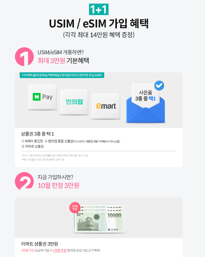 10월 31일까지 kt M모바일을 통해 USIM과 eSIM을 모두 개통하면 최대 30만 원의 상품권 혜택이 주어집니다. 최초 1회 eSIM비가 무료이고 추첨을 통해 이마트 상품권과 IT기기 4종을 선물로 증정합니다. USIM과 eSIM을 각각 개통한다면 최대 3만 원의 기본 혜택과 함께 추첨을 통해 이마트 상품권을 받을 수 있는 기회가 주어지는 만큼 듀얼 회선 활용을 고민 중이시라면 지금 kt M 모바일 eSIM를 선택하고 풍성한 혜택도 받아보시기 바랍니다.