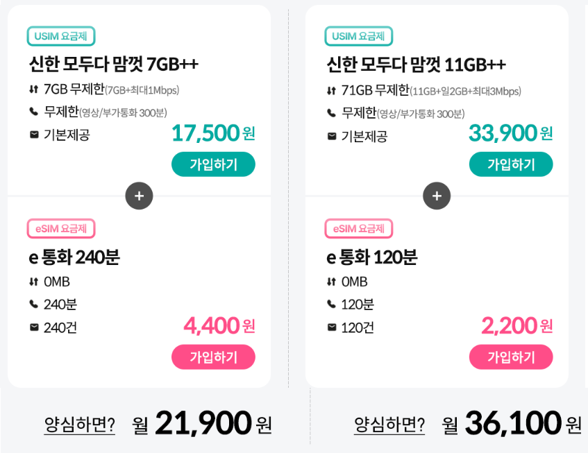 특히 가족 결합이나 약정할인으로 인해 타사 요금제를 필수적으로 사용하더라도 eSIM 요금제 가입이 가능한 만큼 현재 사용 중인 요금제를 신경 쓰지 않아도 됩니다. 오히려 듀얼 번호 사용을 위해 두 개의 핸드폰을 사용하는 불편함보다 편리함이라던가 합리적인 요금은 장점이기도 합니다.