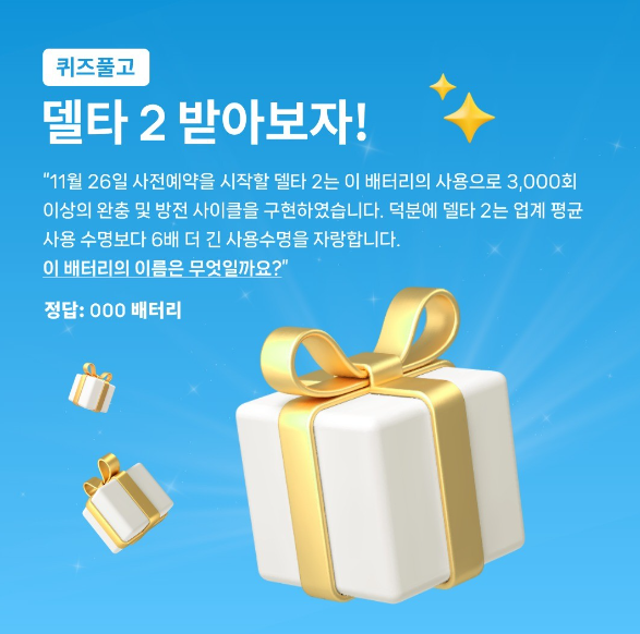 사전예약 출시기념 12월 10일까지 진행되는인스타그램 이벤트도 현재 진행 중입니다. 에코플로우 공식 인스타그램에서 진행되는 퀴즈 이벤트에 참여하면 추첨을 통해 델타2를 선물로 받을 수 있습니다. 친구를 태그하고 참여하면 당첨 확률이 더욱 높아진다고 하니 놓치지 말고 참여해 행운의 주인공도 노려보시기 바랍니다.