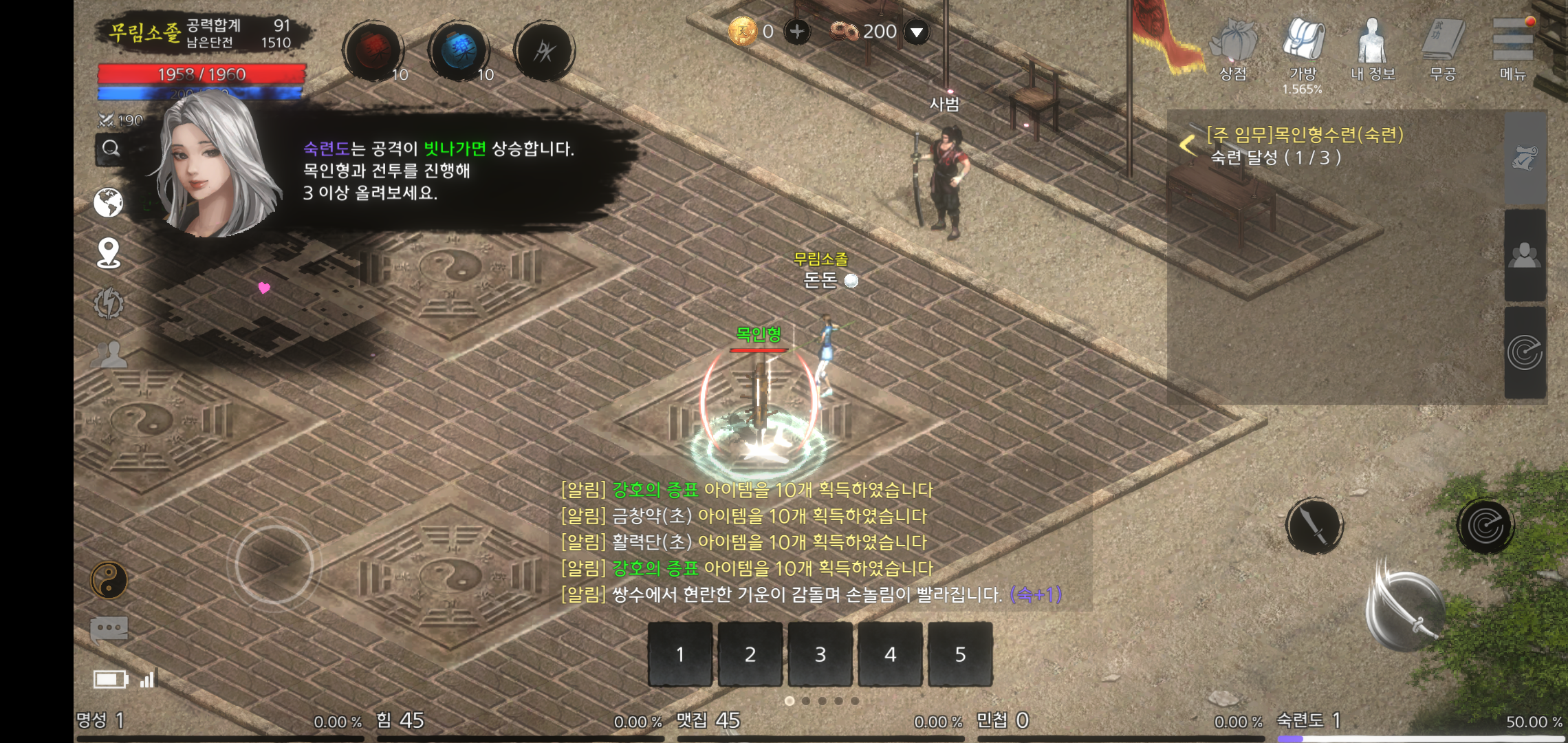 천상비M은 메인 퀘스트를 따라가면서 캐릭터를 육성하는 성장 방식을 가지고 있지만 정통 무협이라는 장르의 핵심인 수련에 대한 내용이 포함되어 있어 무조건 퀘스트만 빠르게 클리어하는 게 빠른 성장의 지름길은 아니라는 점입니다. 힘/ 맷집/ 민첩/ 숙련도에 따라 제대로 공격을 하거나 빗맞음이 발생하는 등 꾸준한 성장을 필요로 하는 점이 특징입니다.
