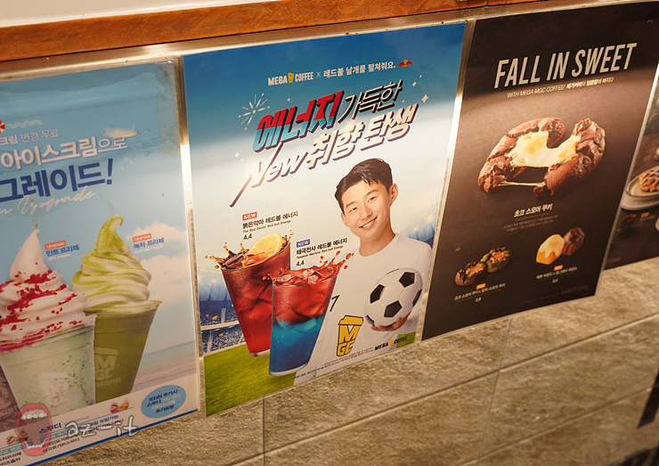 메가커피 매장에 들어서면 고소한 커피향과 함께 바쁘게 움직이는 바리스타들의 모습을 확인할 수 있습니다. 음료를 고르다 보면 픽업하는 곳 하단에 위치한 손흥민 선수를 모델로 한 태극전사 레드불 에너지와 붉은악마 레드불 에너지에 절로 눈길이 머물러 주문을 하고 싶은 충동이 생길 정도입니다.