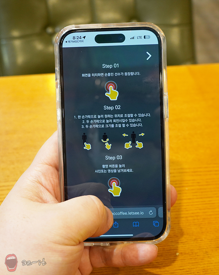 AR소니와 함께 인증샷 이벤트 참여는 무척 간단했습니다. 자리 잡은 메가 MGC커피 매장에서 손흥민 선수와 같이 사진을 찍으면 되는데요, 바닥면이 인식되도록 카메라로 바닥을 비추어 손으로 터치하면 화면에 손흥민 선수의 모습이 등장하게 됩니다.