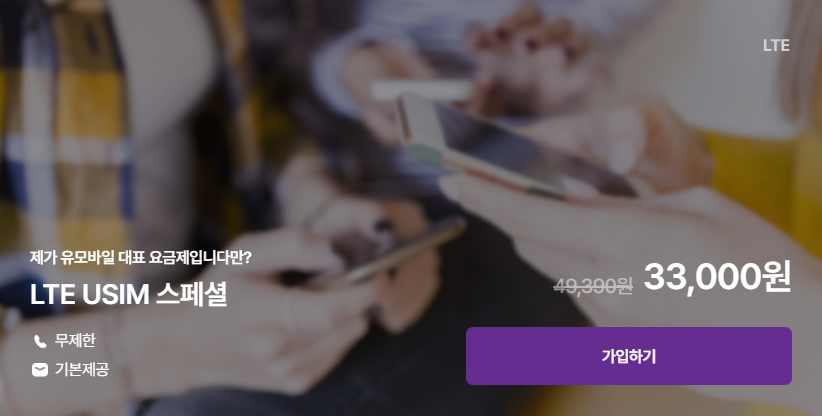 다양한 유모바일의 알뜰폰요금제가 있지만 11GB+일 2GB의 데이터와 통화 무제한, 그리고 문자 기본 조건으로 월 33,000원이라는 비용으로 사용할 수 있어 합리적으로 활용하기 딱 좋다는 생각이 들었습니다. 가입도 대리점 방문 없이 유심 구입만으로 가능하기 때문에 편리하고 말이죠.
