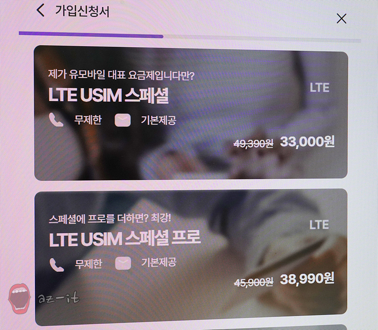 유심 정보를 입력하고 가입 방법을 선택한 다음 원하는 요금제를 선택해 주었습니다. 유모바일에서 선택 가능한 알뜰폰요금제가 많았지만 33,000원 비용으로 이용 가능한 대표 요금제가 라이프스타일과 딱 맞아 큰 고민 없이 가입할 수 있었습니다.