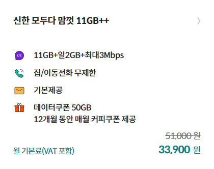 신한 모두다 맘껏 11GB++ 요금제는 데이터 무제한 유금제로 데이터 71GB + 최대 3Mbps 무제한 / 통화 무제한/ 문자 무제한 제공됩니다. 또한 11GB 데이터를 모두 이용했을 경우에는 일 2GB 용량과 최대 3bps 데이터를 사용할 수 있어 저렴한 가격으로 사용량 신경 없이 활용할 수 있는 요금제입니다. 여기에 넘치는 데이터를 2nd 휴대폰이나 태블릿 PC 등 여분 단말에 무료로 나눠 사용할 수 있는 데이터 쉐어링 서비스 이용도 가능해 활용면에서도 으뜸입니다.