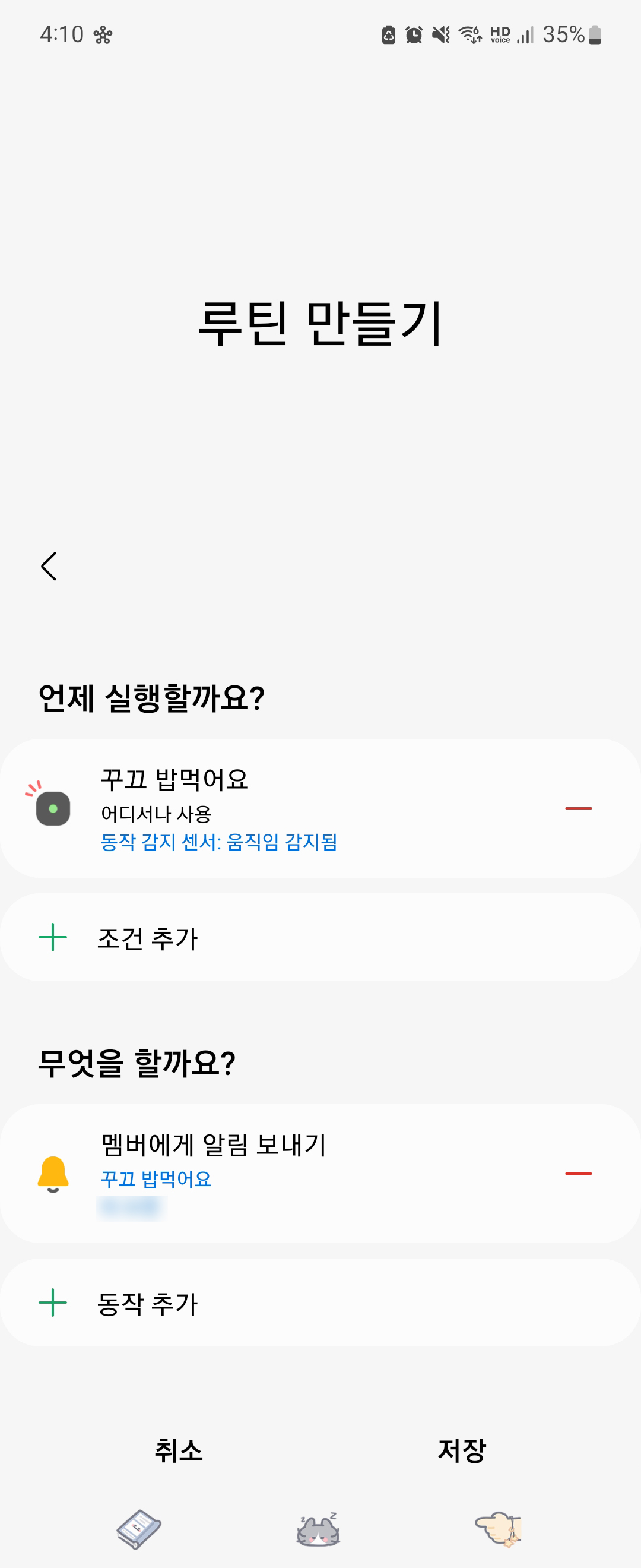 동작감지 센서에 움직임이 감지되면 멤머에게 알림 보내기 루틴을 설정한 후 해당 루틴을 ON으로 설정해 두면 움직임이 감지될 때마다 푸시 알람으로 해당 상황을 인지할 수 있게 됩니다. 반려동물을 키우거나 집을 비우는 등 특정한 움직임이 발생할 때 이를 빠르게 확인하고 싶다면 동작감지 센서 설치를 추천드립니다.
