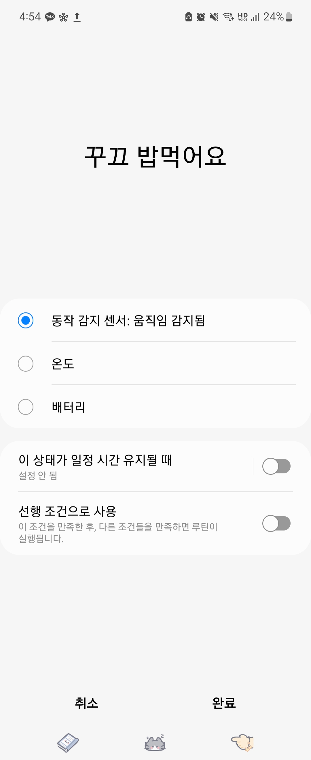 동작감지 센서의 경우 움직임이 감지되는 상황이 발생하면 이후 상황에 대한 설정을 진행하게 됩니다. 스마트싱스 스테이션과 연동된 기기를 제어하거나, 알람을 주는 설정을 진행할 수 있어 상황에 따른 적절한 대처를 미리 할 수 있도록 도와주고 있습니다.