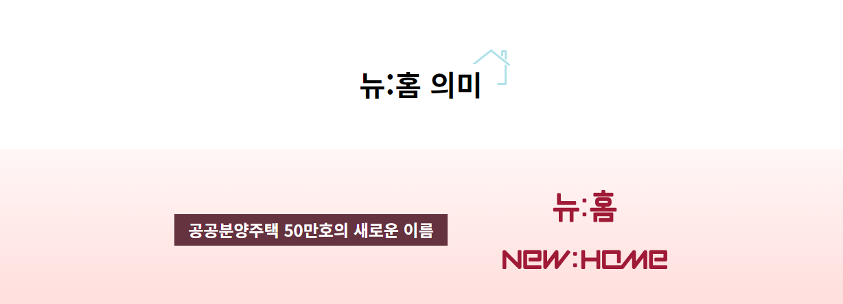 공공주택분양 50만호의 부랜드 뉴:홈(NeW:HOMe)은 내 집 마련, 주거 상향 등 새 정부 정책원칙 및 국민 수요를 담고 첫 집, 새로운 주거 문화 및 희망 시작이라는 의미를 담은 브랜드 명입니다. 새로운 나움. 선택형 분양부터 청년 특공, 획기적 전용 모기지로 청년, 서민의 내 집 마련 부담을 덜어주는 새로운 솔루션을 제시합니다.