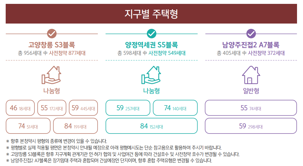 처음부터 분양받되 장기 모기지로 내 집 마련 기회를 제공하며, 의무 거주기간 이후 공공에 환매 시 처분 손익의 70%가 귀속되는 나눔형으로 공급이 진행될 고향 창릉은 총 877호가 구성되어 있습니다. 지구 내 GTX 역 신설이 예정되어 있고 첨단일자리 중심의 직주 근접공간으로 교통과 생활 편의가 밀집된 지역으로 눈여겨볼 필요가 있습니다.
