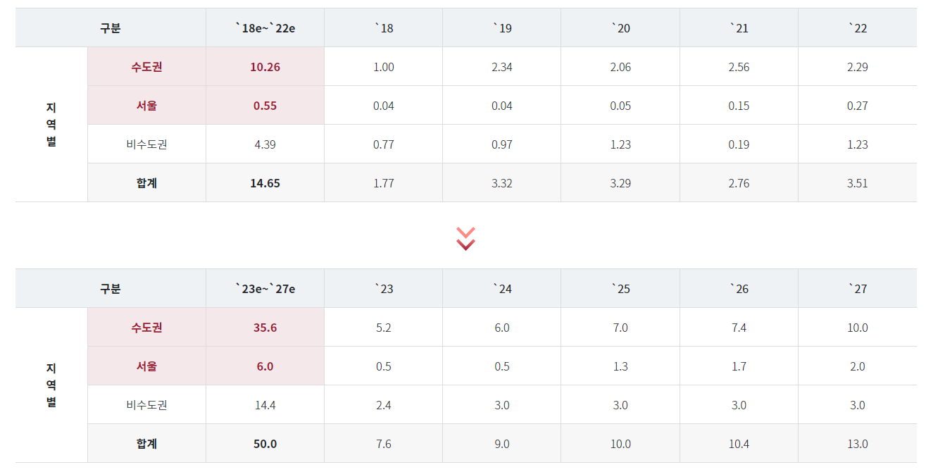 공급계획 또한 대상별, 지역별로 구분되어 보다 구체적인 공급이 진행될 얘정입니다. 대상별의 경우 청년층 34만 호, 청년층 외 약 16만 호가 구성되어 있고, 지역별의 경우 서울 6만 호를 포함해 수도권 36만 호 대규모 공급을 오는 2027년까지 목표로 두고 있습니다.