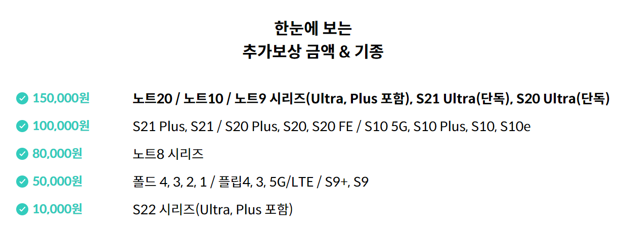 민팃 추가보상은 기종에 따라 다르게 책정되어 있습니다. S22시리즈의 경우 1만 원 추가보상 금액이 지급되는 걸 시작으로, Z Fold & Z Flip 전 시리즈, S9 시리즈는 5만 원, 노트 8 시리즈는 8만 원, S21, S20(울트라 제외), S10시리즈는 10만 원, S21 울트라, S20 울트라, 노트 20, 노트1 0, 노트시리즈는 15만 원의 추가보상 금액을 받을 수 있습니다.